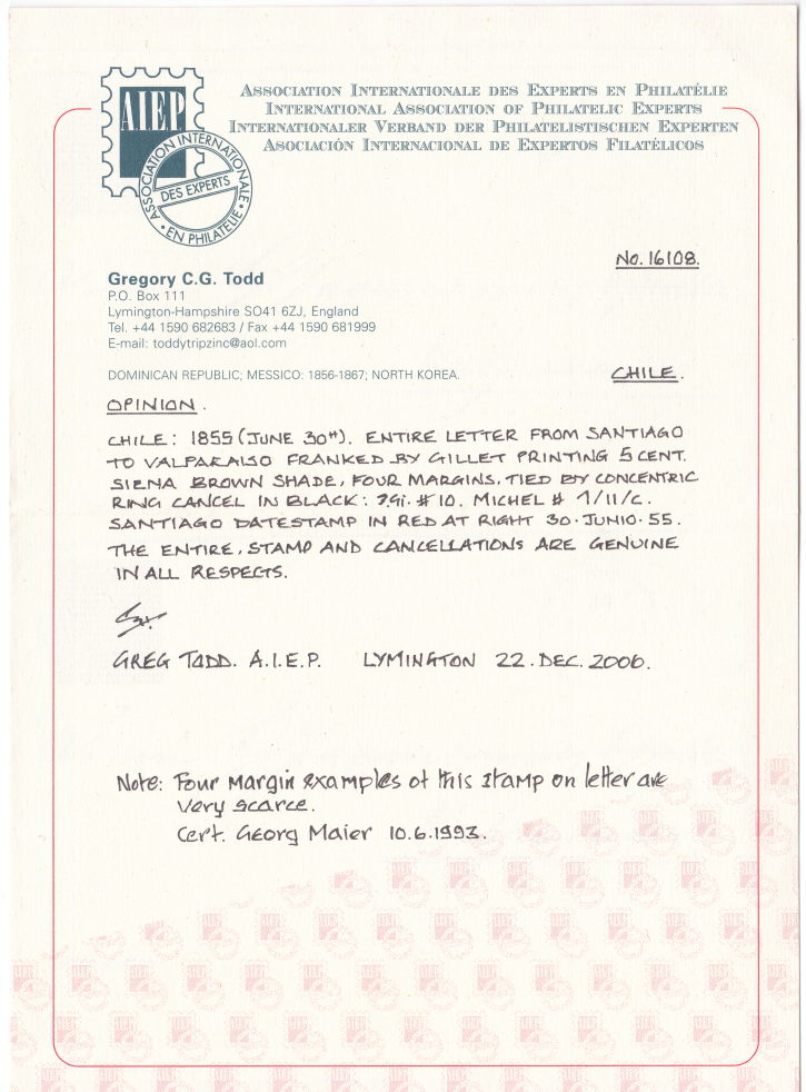1854 (April), Gillet Recess Printing 5 centavos siena, fresh colours, good to large margins all round, neatly tied by target cancel to entire letter (with contents) to Valparaiso with adjacent departure red small type cds "SANTIAGO 30 JUNIO 55". An extremely scarce stamp on cover in such a very fine quality. Certificate Todd AIEP (2006) and short opinion Maier (1993).